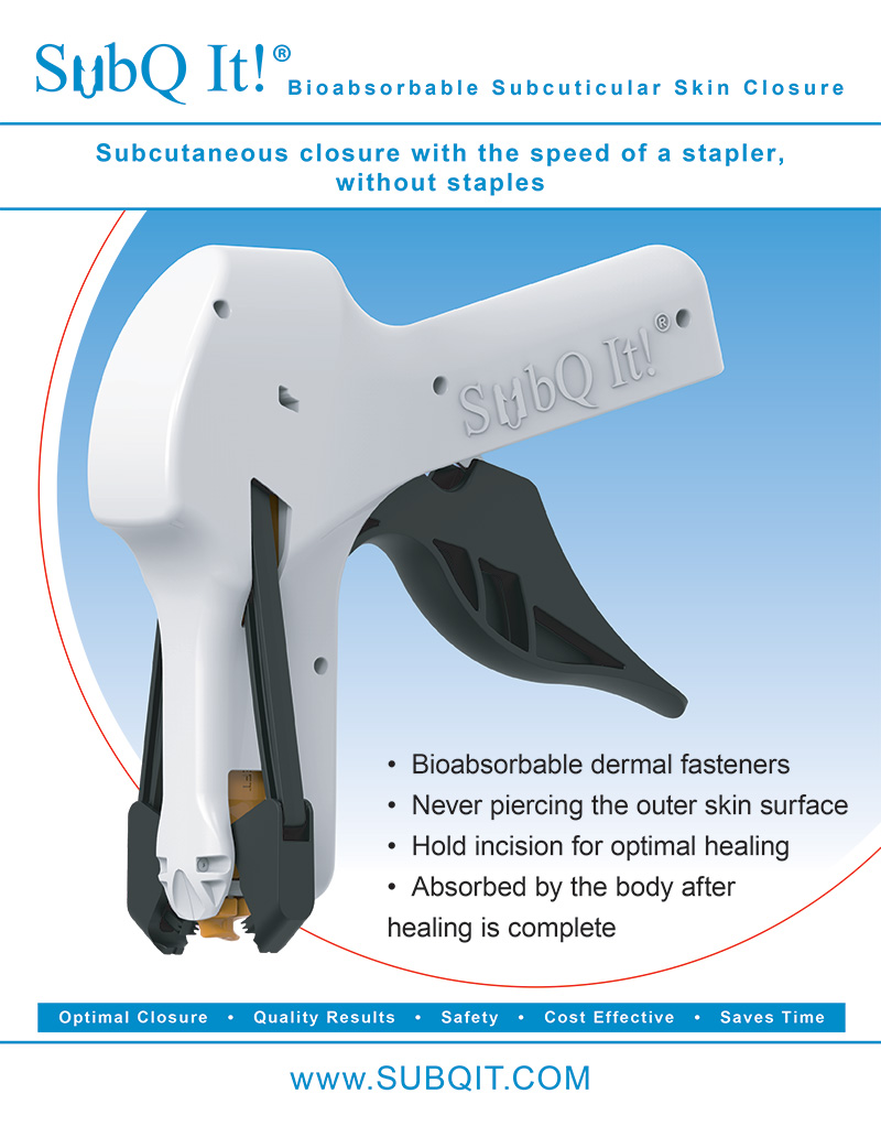 This device is a wound closure device that uses bio-absorbable fasteners with barbs to close the incision. The fasteners are positioned to properly evert the skin for optimal wound closure leaving the best looking most minimal scar. It is like putting a plastic surgeon in the palm of every surgeon’s hands. We are very proud of this FDA compliant device and so confident in the device that it was used on the founder’s wife to close a 5-inch incision.